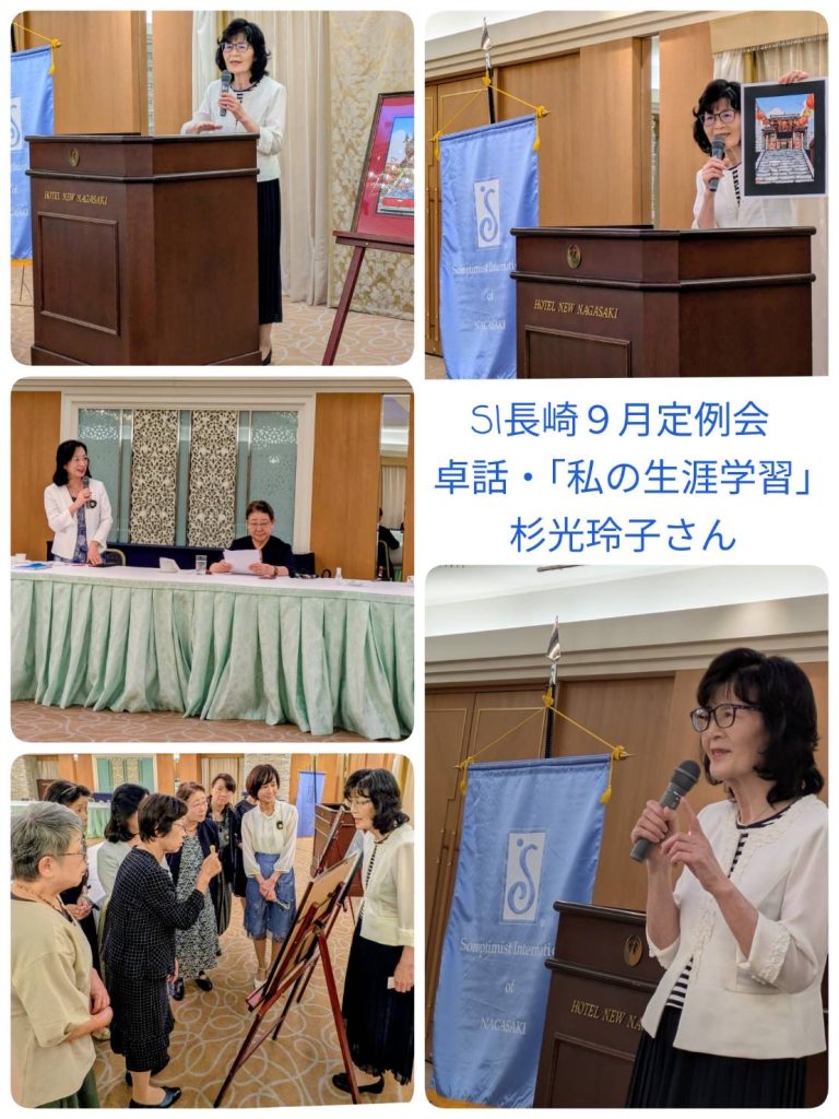 9月定例会において、教育現場の第一線で長年ご活躍されてきた杉光玲子先生をお招きして卓話を開催しました.杉光先生は、校長として赴任された市内小学校や教育委員会など教育現場の第一線で長年ご活躍され、現在は、社会福祉活動や切絵の制作に熱心に取り組まれています。「人生100年時代」を迎えた現代に生きる私たち。年齢を重ねて、より一層健康で心豊かに人生を楽しむ秘訣を教えていただきました。細部まで魂の宿るような杉光先生の素晴らしい作品の数々にも会員一同魅了されました。「長崎の美しい街並みは、切絵の題材として最高です」とのこと。皆様も機会がございましたら、ぜひご鑑賞ください!賞ください!